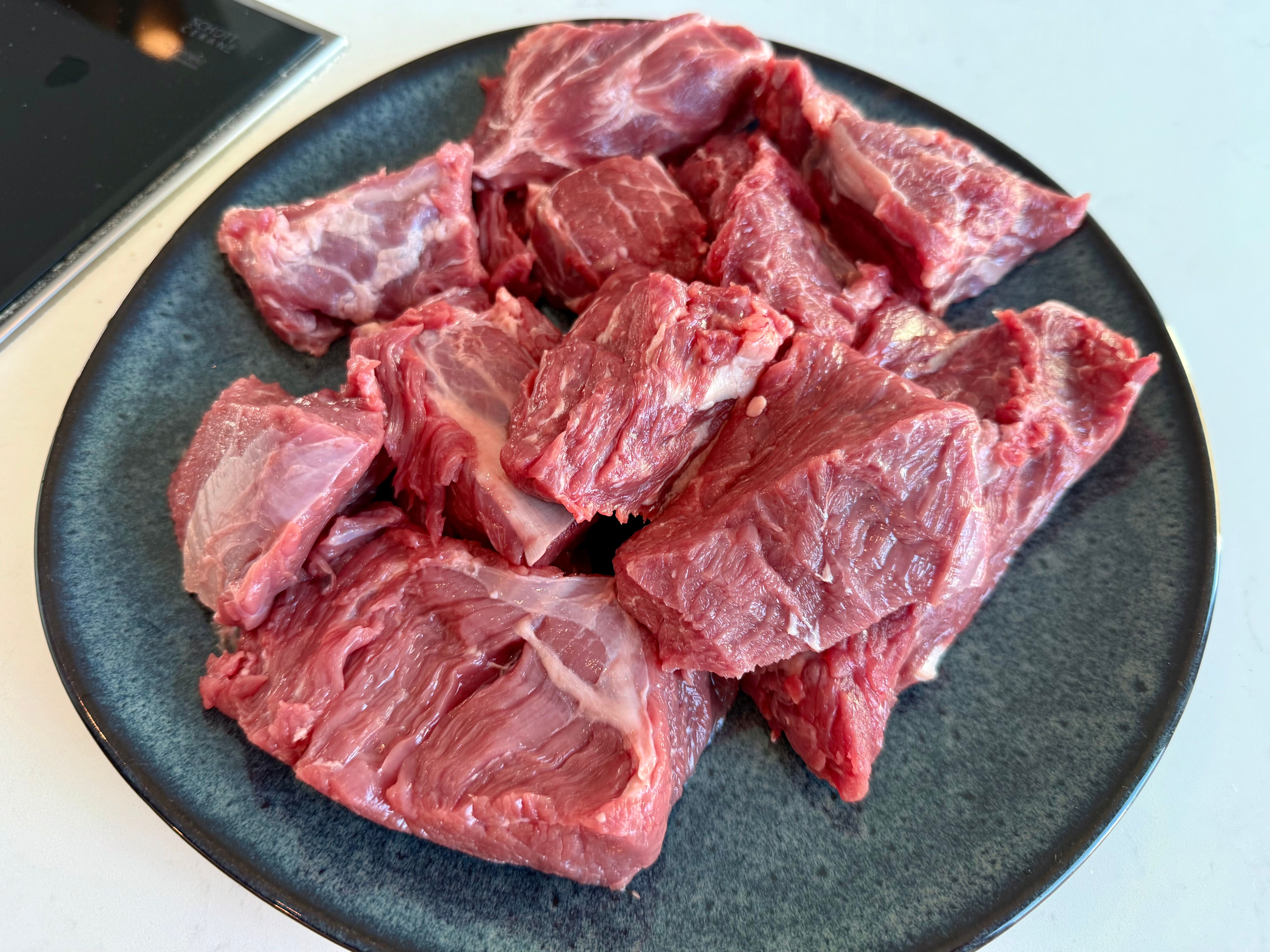 Forberedelser Begynn med å rense kjøttet grundig og del det i grove biter. Krydre kjøttbitene generøst med salt og nykvernet pepper, og vend dem deretter i hvetemel. Dette trinnet er viktig både for smaken og for å gi sausen fin konsistens. Brun kjøttet i porsjoner i varm panne med smør til det får en fin stekeskorpe, og legg det til side. Deretter stekes baconterninger sprø og gylne. Ta vare på baconfettet i gryten - det gir fantastisk smak!