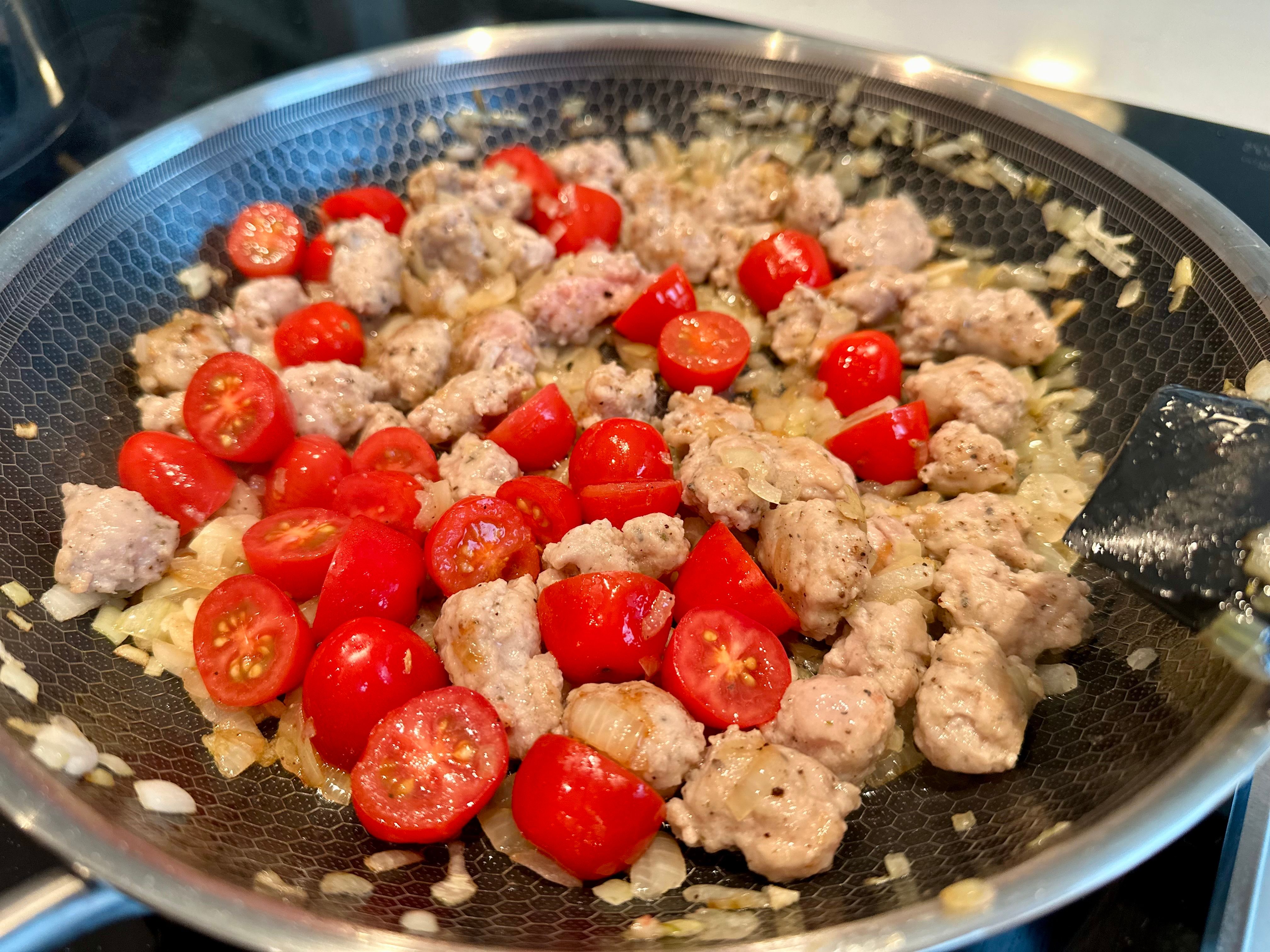 Når pølsekjøttet er gyllent tilsetter du tomatene. Krydre med salt og pepper og tilsett og stek på lav varme i 5 minutter til tomatene er bløte. Ha i et par spiseskjeer med pastavann.