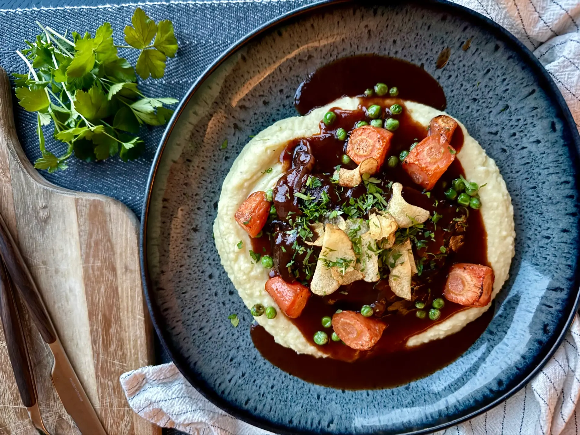Server den langtidskokte høyryggen med en kremete potetstappe som tar opp den fyldige rødvinssausen. Vi hadde noen gulrøtter i ovnen og drysset over litt erter på slutten av steketiden. Pyntet også med litt sprø salte sørlandschips på toppen.