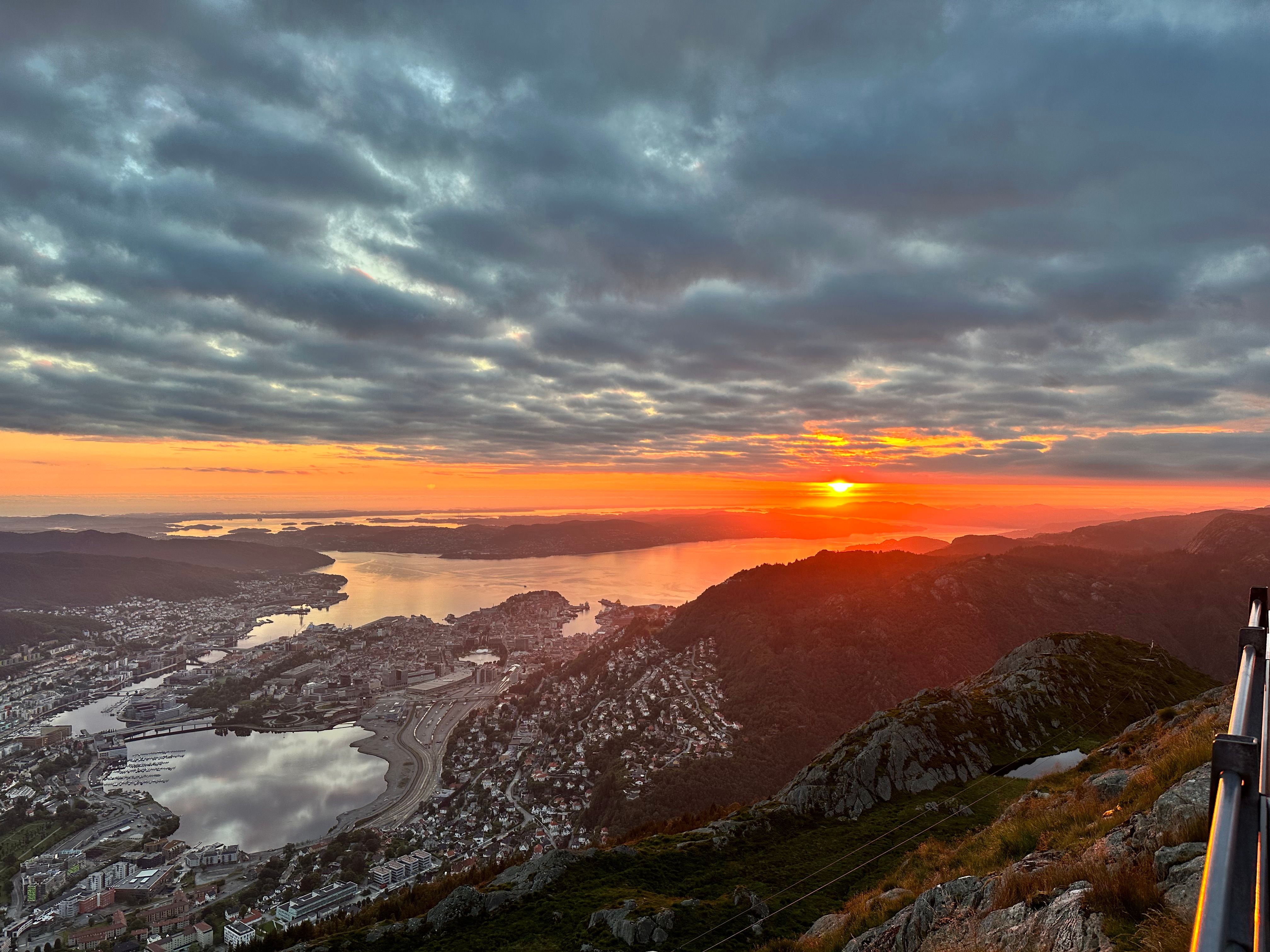 Du tar Ulriksbanen opp, og billetten er inkludert når du booker middagspakke. Bestill bord til klokken seks eller sju og bli sittende til gondolen stenger ved elleve. Se byen tenne lysene mens du jobber deg gjennom menyen. Vil du gjøre det enklere, stikk innom Ulriken Kafé uten reservasjon for kaffe og noe lettere. Men gjør deg selv en tjeneste og book restauranten minst én gang.